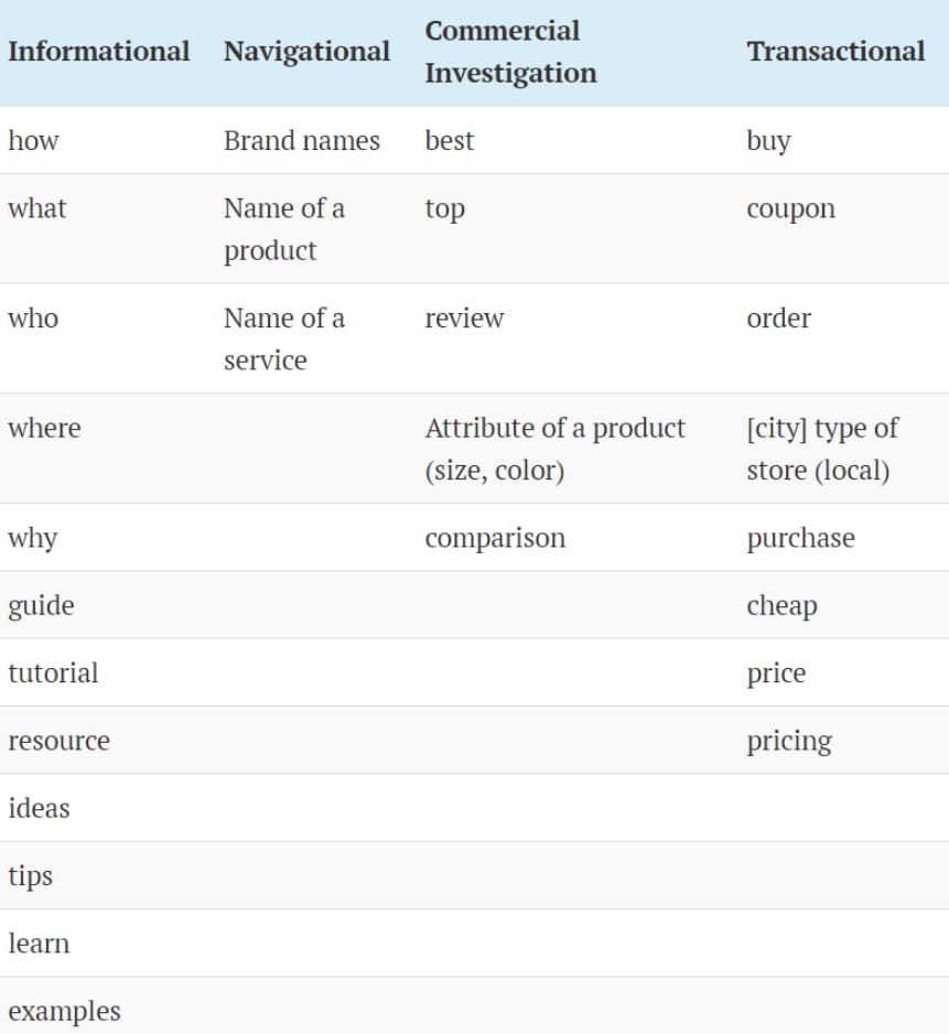 Ahrefs provides the list of modifiers specific to every type of search intent: