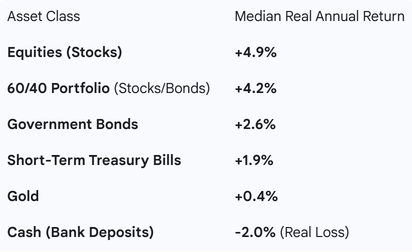 - Government Bonds have yielded barely any return, averaging only 0.6%–0.9% per year.