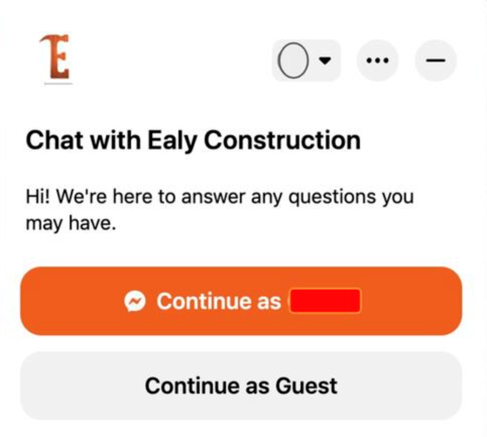 Ealy Construction builds a lead base with this Messenger chatbot on the homepage. If a visitor chooses to continue with their Facebook account, the brand receives access to their profile data, which it could use for marketing.
