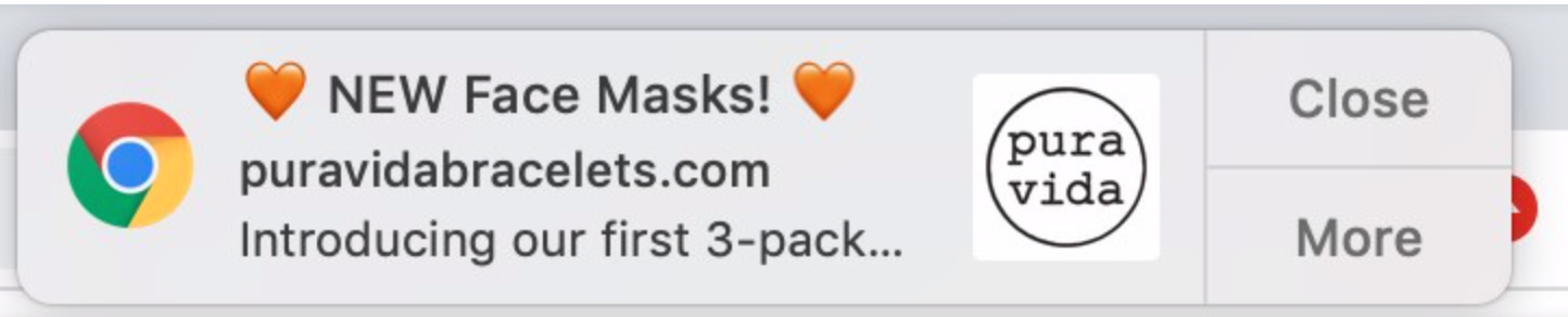 Pura Vida, a Shopify online store, sends these push notifications to announce new arrivals in a product category that a customer bought an item from.