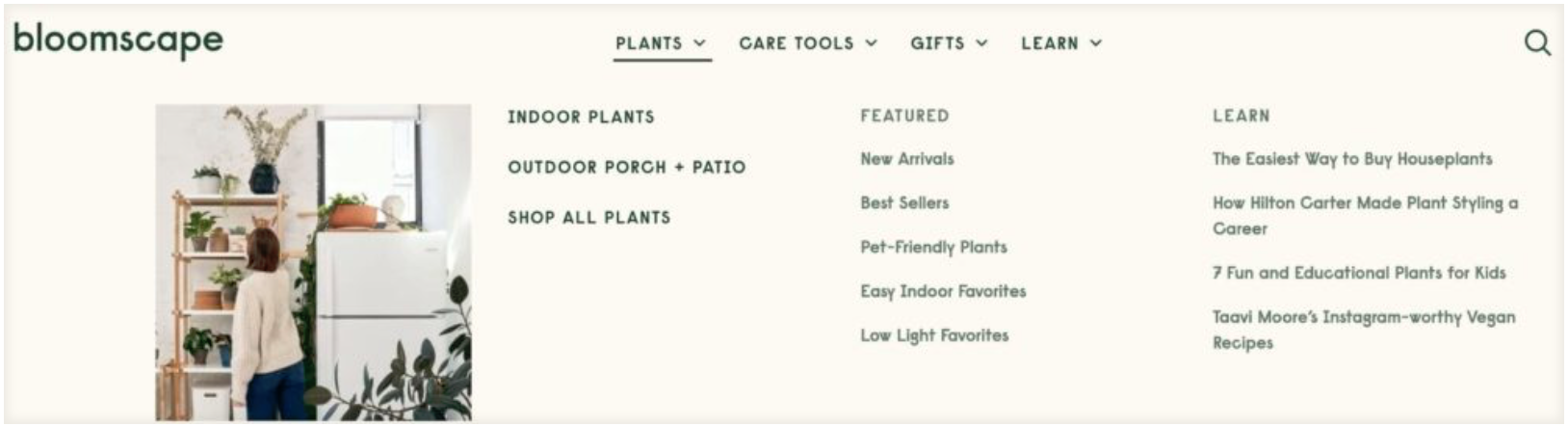 Bloomscape, an online store selling indoor plants, has a menu where each main category is broken down into three subcategories: