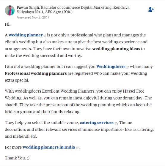 Quora is really an awesome platform and completely underused by marketers, companies, startups and executives and this is why this is one of my favorite CRO hacks. With the right strategy, you can turn Quora into a lead generation machine. On Quora, you can enter a simple query like “find a wedding planner” to look for questions that your prospective leads are asking.