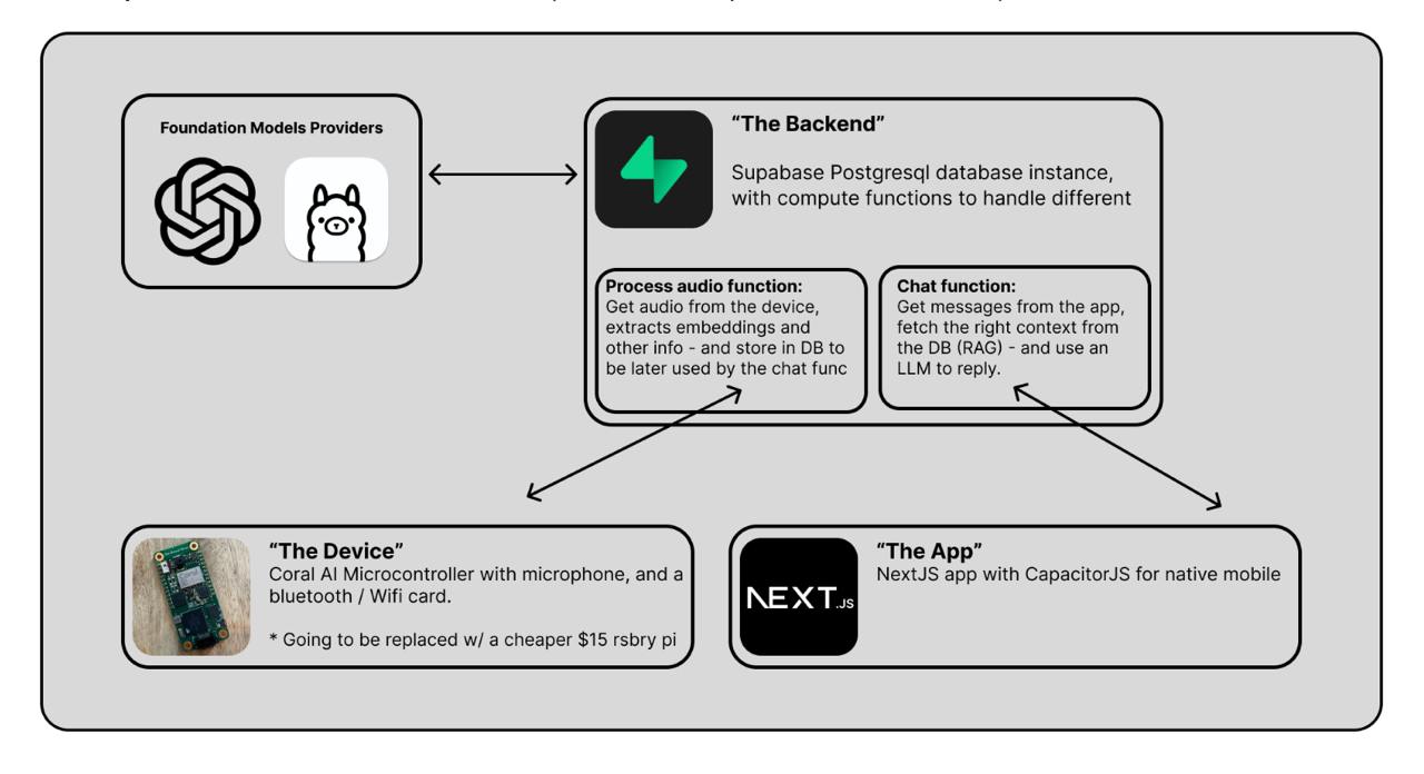 ADeus is built with a sleek ACM-metallic device, a user-friendly mobile/web UI, and a robust Supabase backend integrated with large language models (LLMs).