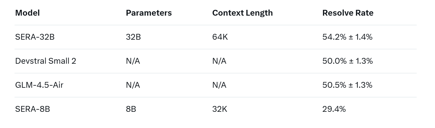 These features make SERA accessible for small teams, requiring only standard supervised fine-tuning (SFT) without custom reinforcement learning (RL) tools.
