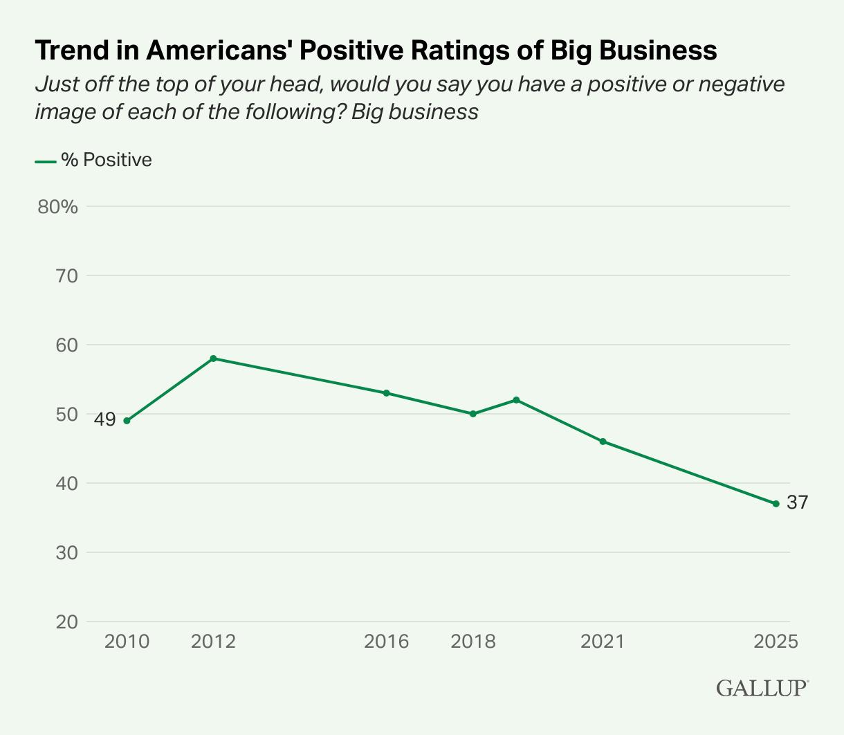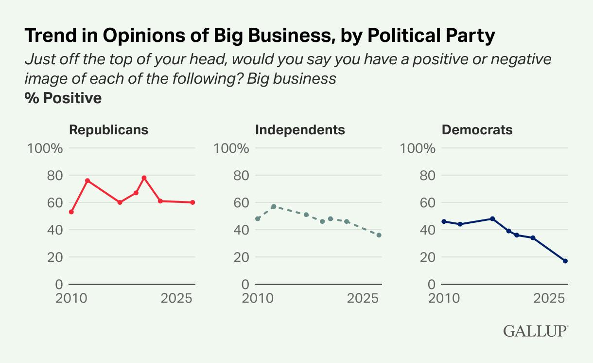 Compounding the narrative, positive ratings of big business plunged to 37% - a sharp fall from 46% in 2021 and a far cry from peaks above 50% in earlier decades.