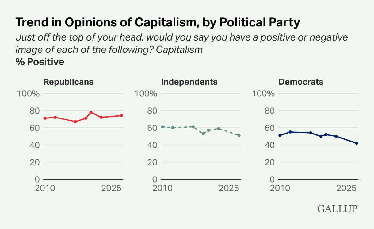 The decline is driven primarily by Democrats and independents, each dropping eight percentage points since 2021. Younger Democrats (under 50) are particularly skeptical of capitalism, viewing it less favorably than older counterparts.
