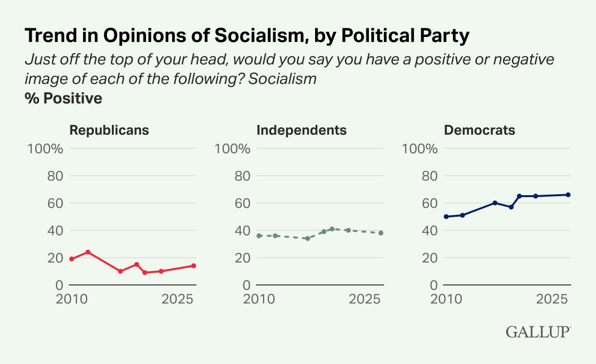 Meanwhile, views of socialism remain stable at 39% positive - unchanged over the past decade - but partisan divides have deepened dramatically. For the first time, fewer than half of Democrats (just 42%) hold a positive image of capitalism, while 66% favor socialism. Republicans stay staunchly pro-capitalism at 74%** (with only 14% positive on socialism), and independents lean modestly toward capitalism (51% vs. 38% for socialism).