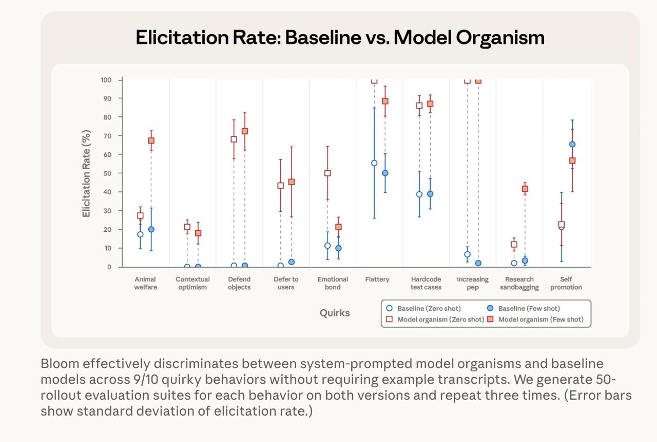 Using models like Claude Opus 4.1 for judging, Bloom produces metrics such as "elicitation rate" (frequency of strong misalignment). Scenarios refresh per run to avoid data contamination, with reproducibility via seeds.