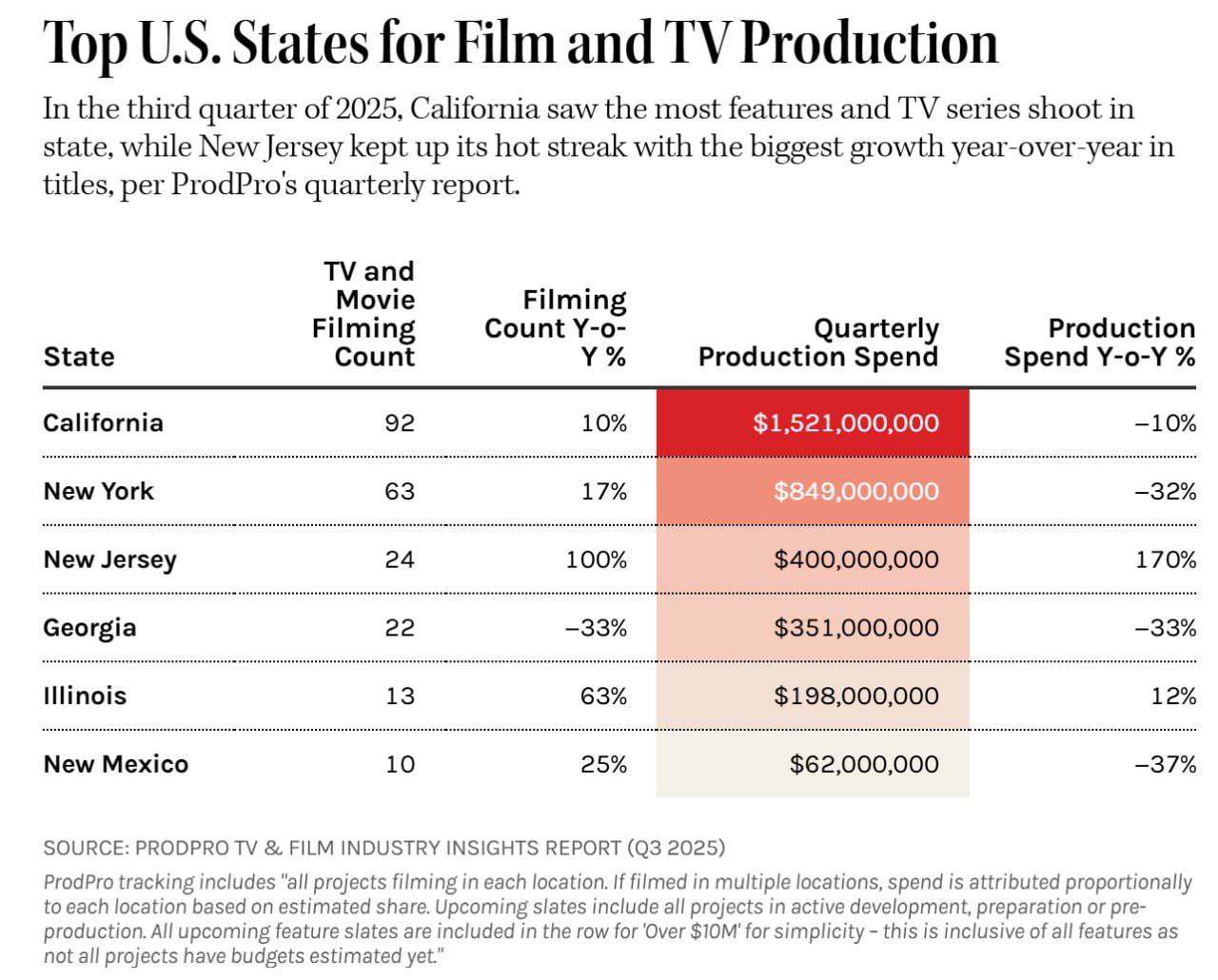 Zoom out, and the interstate arms race sharpens. California still dominates with 92 titles filming in Q3, but New Jersey's 100% title surge and $400 million spend (up 170%) signal a Northeast renaissance, fueled by 30-40% transferable credits. New York trails with 63 projects but a robust 23% growth in spend, while Georgia's 22 titles reflect a 33% dip amid post-production tweaks.