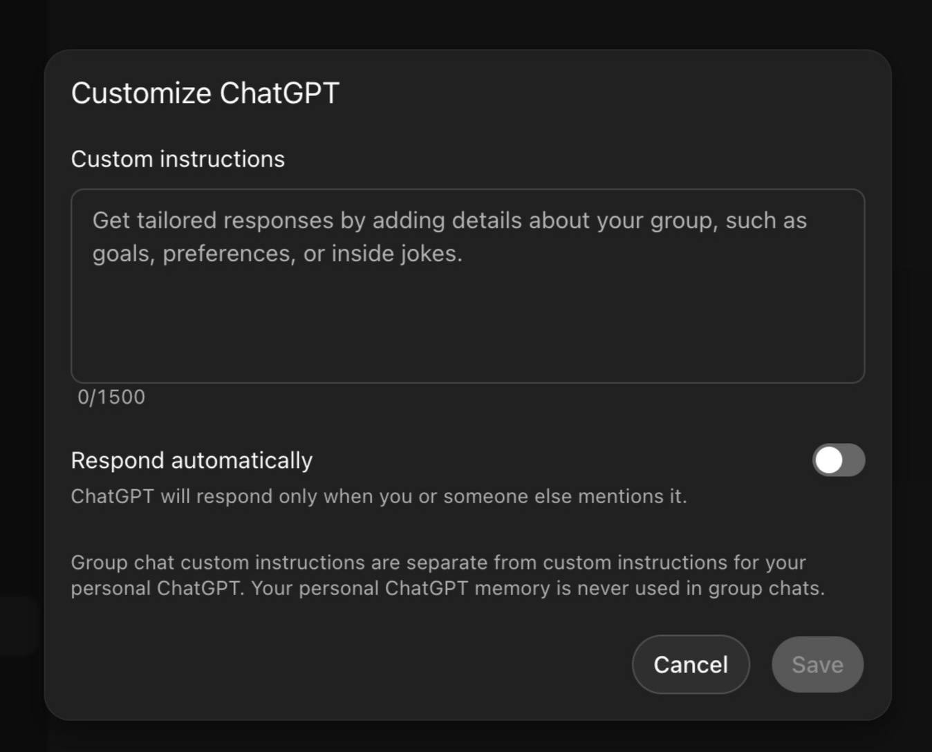 But the real spice? Granular controls that scream "enterprise-ready." Group chats come with their own custom instructions, decoupled from your personal AI quirks – no more bleeding your solo brainstorming vibes into a boardroom brainstorm.