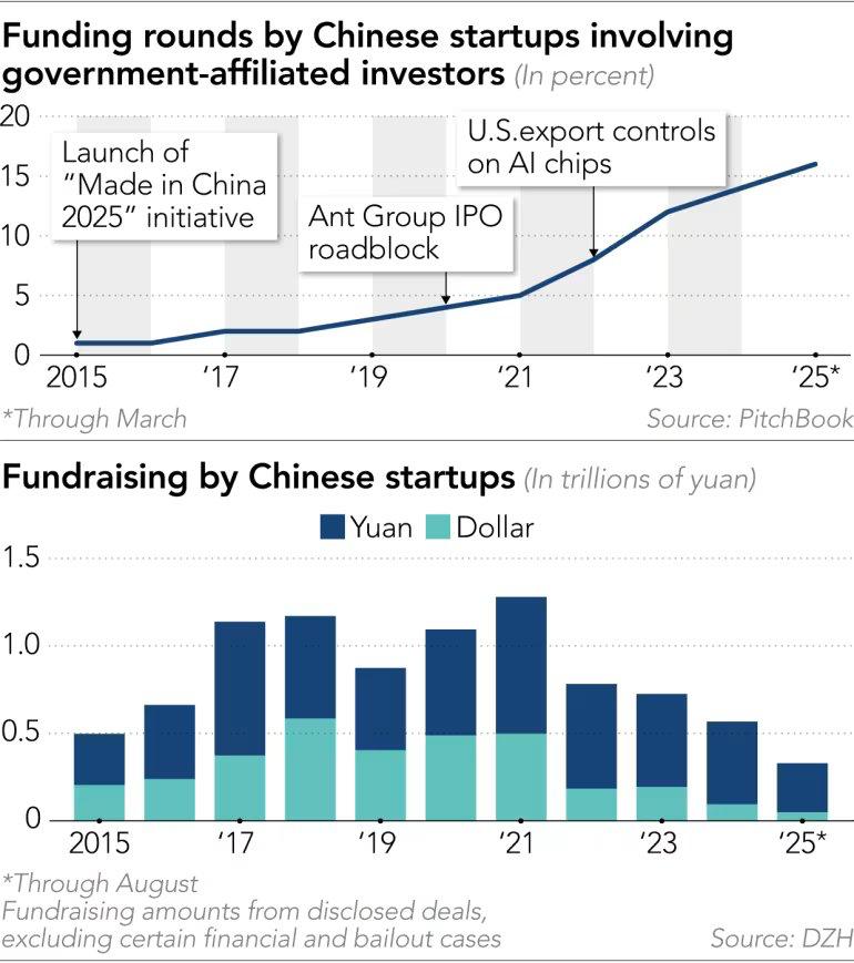 Beijing appears comfortable with the trade-off. Local government guidance funds, which raised a record 1.9 trillion yuan ($270 billion) in new commitments in 2023–2024 alone, have ample dry powder. State-backed chip fund “Big Fund” Phase III closed at 344 billion yuan in May 2024, and numerous provincial mega-funds targeting semiconductors and AI routinely exceed 100 billion yuan each.