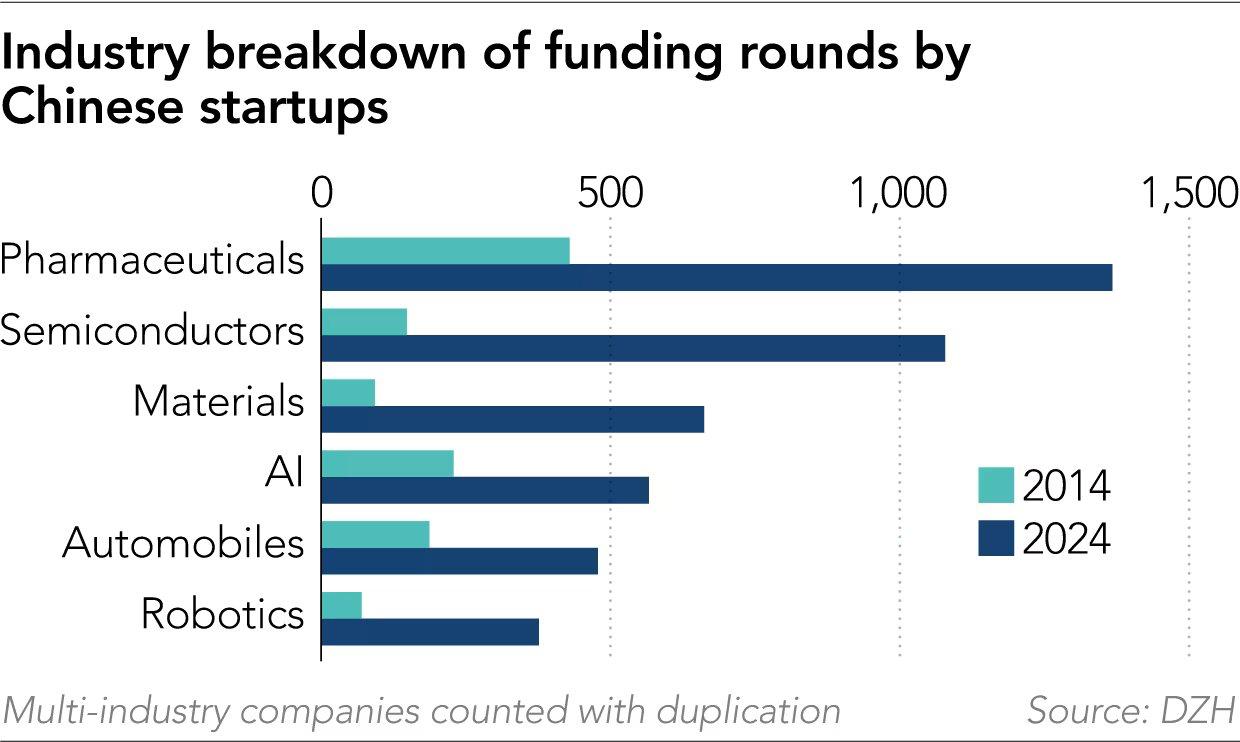- Pharmaceuticals & biotechnology now lead the pack in number of funding rounds, followed by semiconductors, advanced materials, AI, automobiles (especially EV and autonomous driving), and robotics (DZH Research, 2024 vs 2014 comparison).