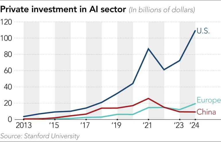 Meanwhile, global private investment in AI continues to concentrate in the United States. Stanford University’s latest data (AI Index 2025 preview) show U.S. private AI investment reaching approximately $110 billion in 2024, compared with a sharp decline in China’s dollar inflows and only modest growth in Europe. The gap has never been wider.