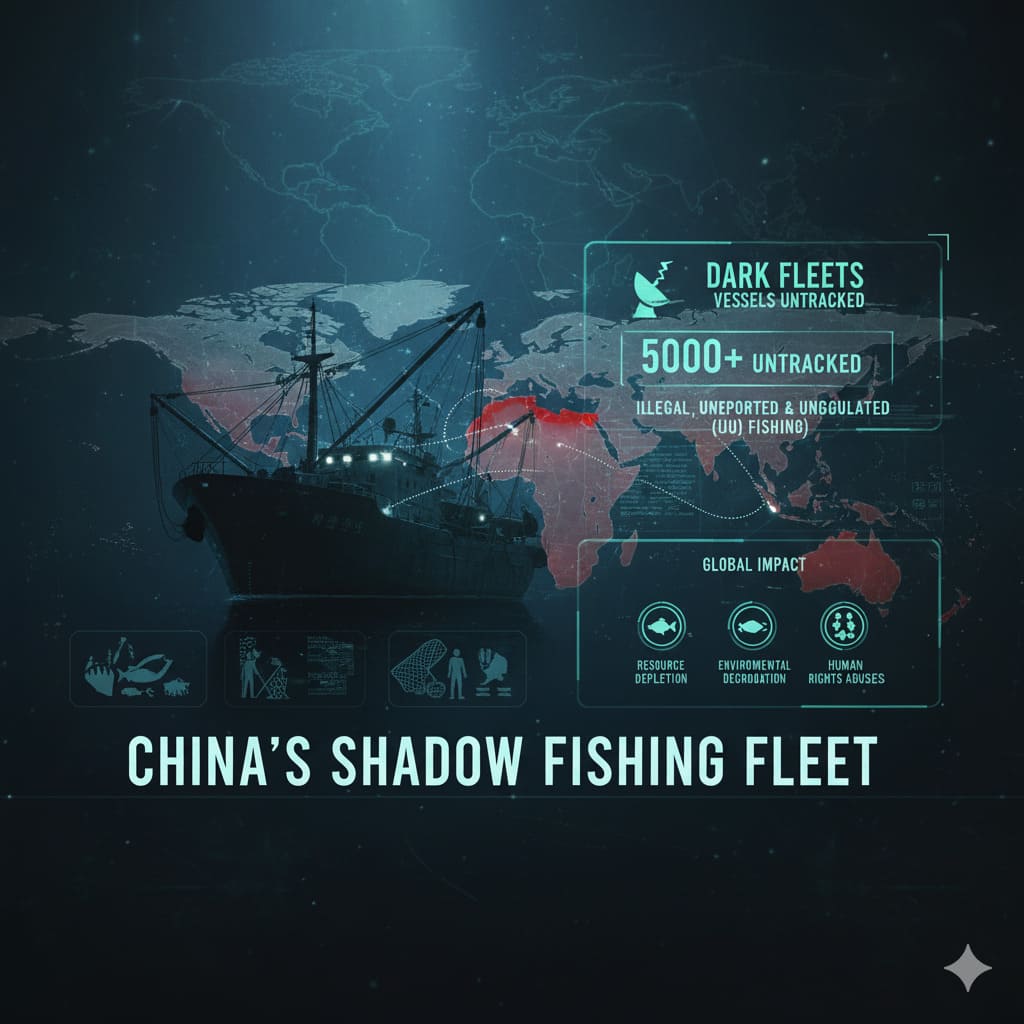 The concept of a "shadow fleet" refers to the massive and often invisible operation of China's Distant-Water Fishing (DWF) fleet, which is the largest in the world. This fleet operates far from Chinese shores, often engaging in illegal, unreported, and unregulated (IUU) fishing, environmental degradation, and human rights abuses in the hidden, deep-water regions of the ocean.