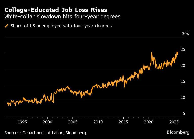 This milestone highlights a dramatic slowdown in white-collar hiring, with over 1.9 million adults aged 25 and older holding at least a bachelor's degree out of work - a stark contrast to minimal rises in unemployment for those with lower educational attainment.