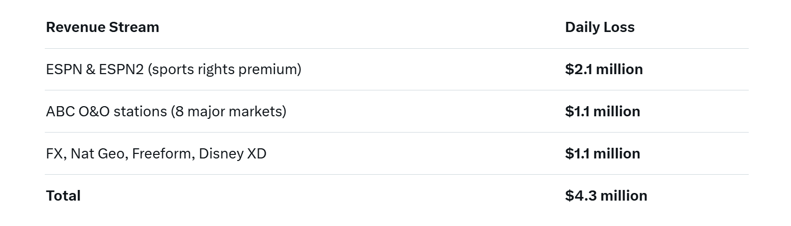 The figure assumes an average blended affiliate fee of $13.80 per YouTube TV subscriber for Disney’s full suite – a rate confirmed by SNL Kagan’s Carriage Fee Database. With 6.8 million subs, that’s $93.8 million in monthly revenue at stake. Every 24 hours without a deal adds another $4.3 million to Disney’s tab.