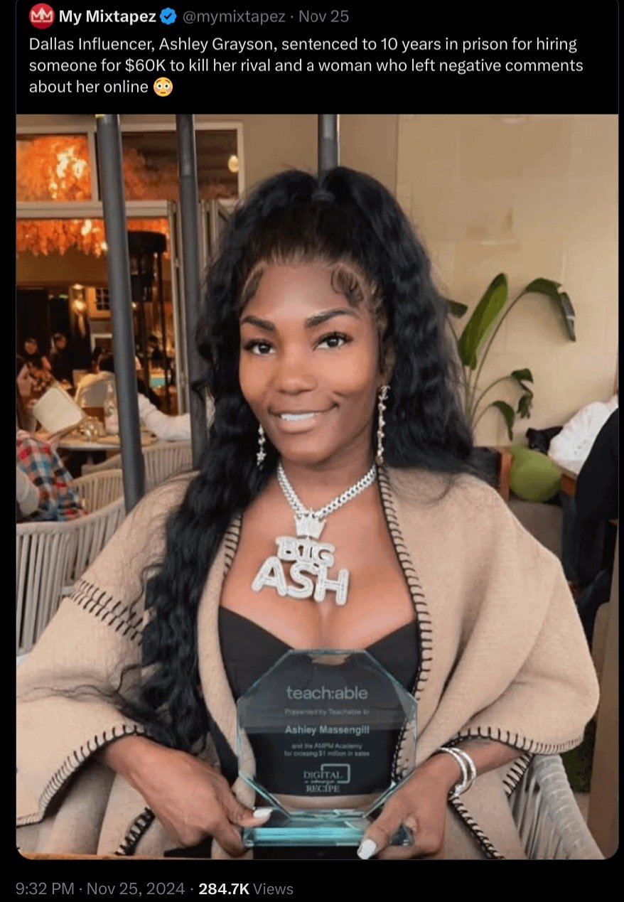 In 2022, Grayson’s success was overshadowed by a chilling plot. Federal prosecutors revealed that she offered a Memphis-based couple $60,000 to kill three people: her ex-boyfriend, a Mississippi woman running a similar Teachable-based business, and a Texas woman who had posted a negative comment about Grayson’s course online.