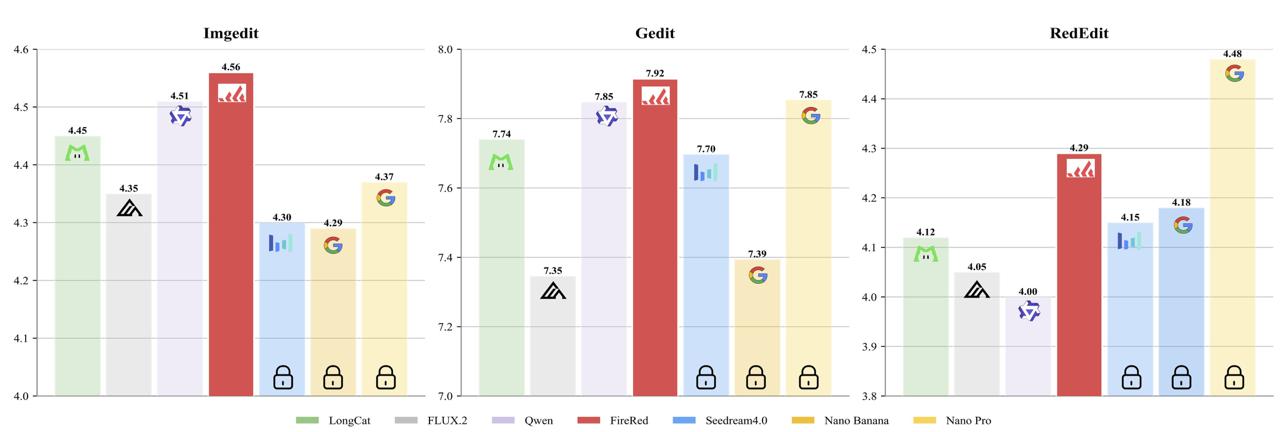 In rigorous evaluations, FireRed-Image-Edit-1.1 establishes a new state-of-the-art (SOTA) among open-source models on key benchmarks such as Imgedit, Gedit, and RedEdit. It even surpasses some closed-source competitors in specific areas, with human evaluations confirming superior prompt adherence and visual coherence.