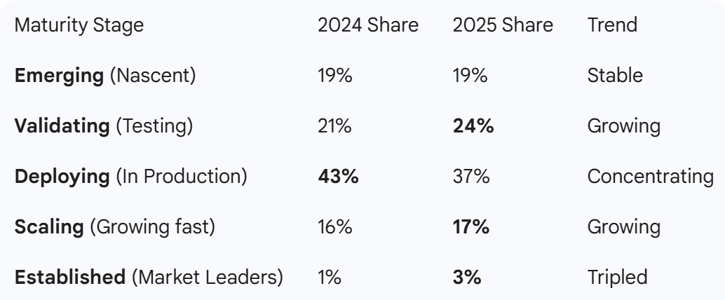 The increase in "Established" and "Validating" companies suggests the market is maturing. We are moving away from purely experimental "Deploying" phases into companies that have either found a solid product-market fit or are in the process of proving it.