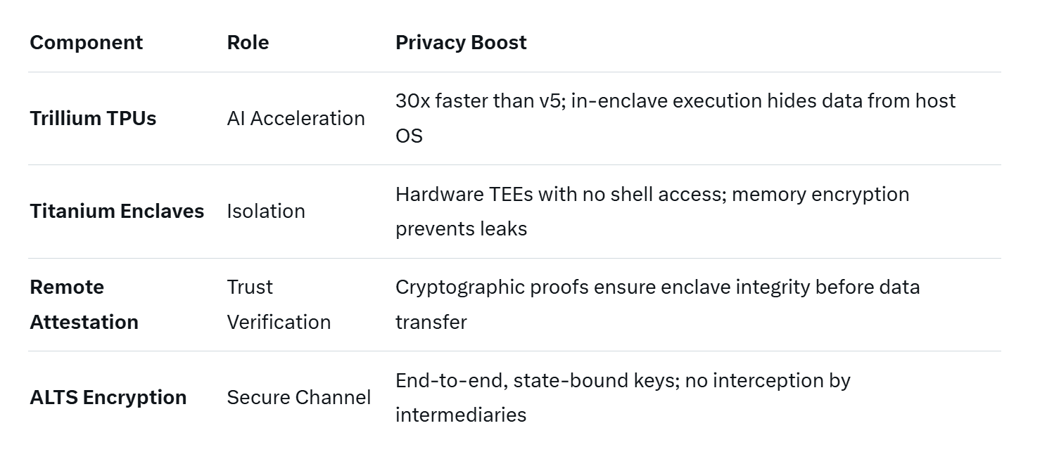 At its core, Private AI Compute runs on Google's proprietary stack: Trillium Tensor Processing Units (TPUs v6) for blistering AI inference (up to 4,000 teraflops per pod) and Titanium Intelligence Enclaves (TIE) for unbreakable isolation. TIE, an evolution of Google's Titan security chips, creates hardware-rooted Trusted Execution Environments (TEEs) using AMD SEV-SNP for CPUs and custom hardening for TPUs - encrypting memory in transit and at rest, preventing host reads.