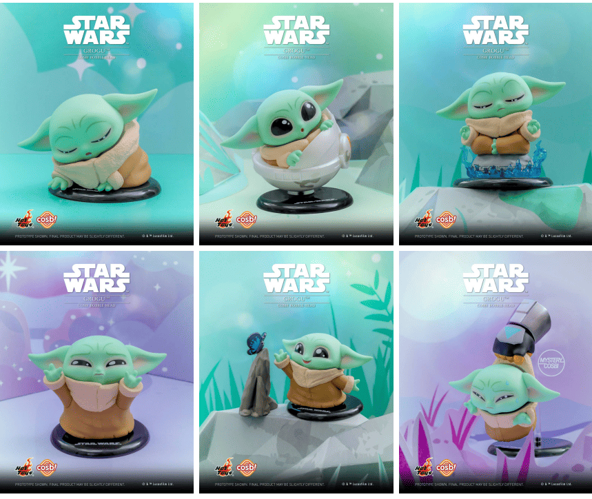 Each box contains a randomized Grogu figurine, standing between 5 to 9 cm tall, along with a collectible card.
