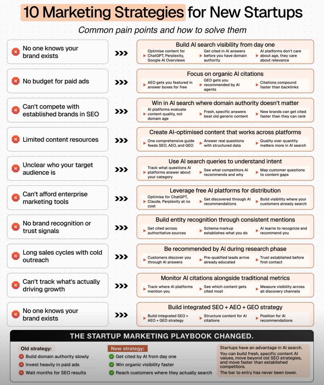 Resource constraints force startups to prioritize efficiency, and AI amplifies this need. Instead of churning out hundreds of keyword-stuffed articles, focus on creating one comprehensive guide that serves multiple purposes: traditional SEO, AEO for direct answers, and GEO for generative citations.