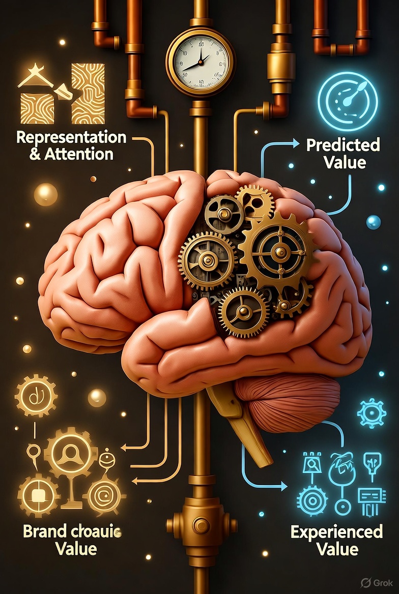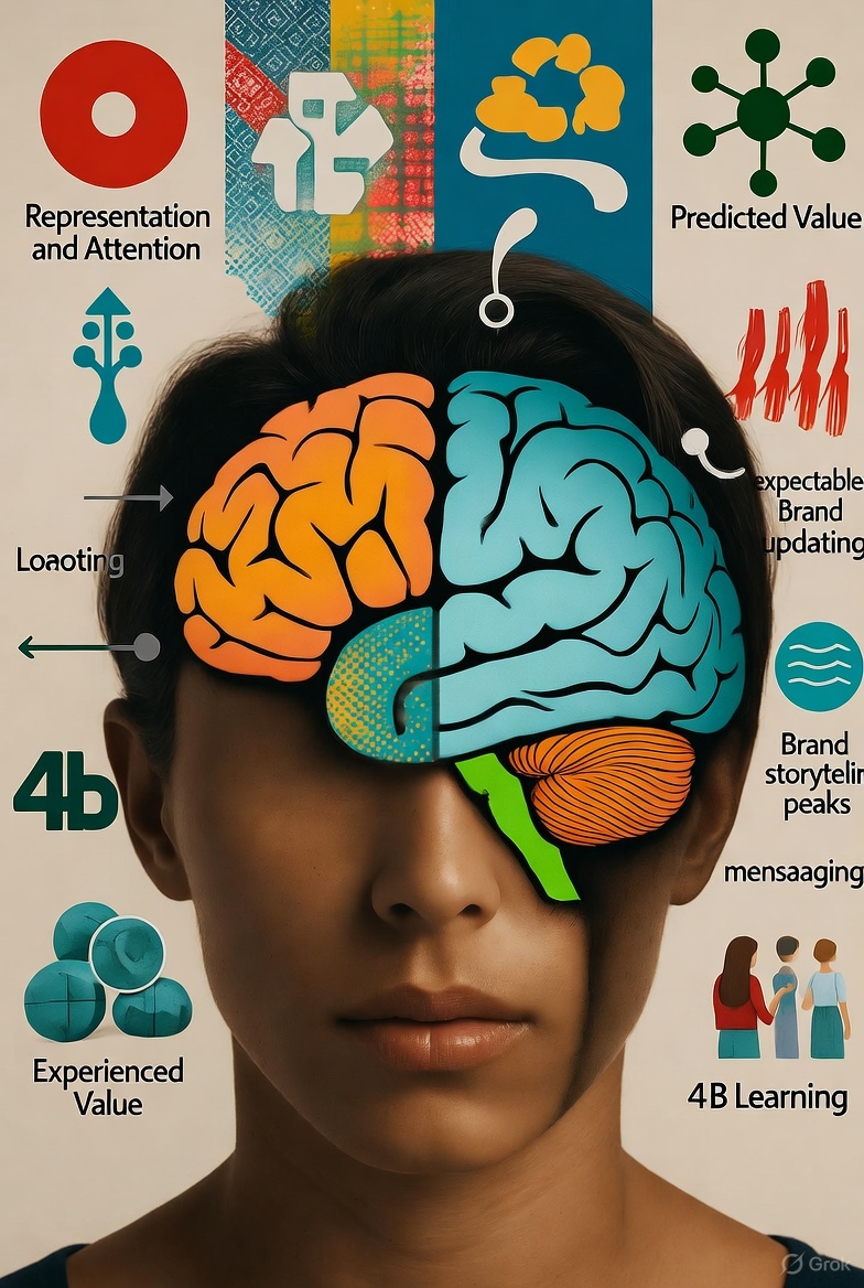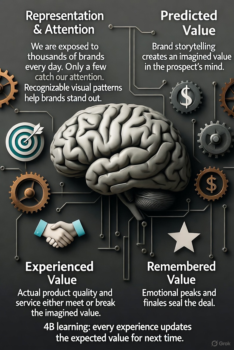 Every interaction updates the brand's associative map in our minds via the 4B model (Beliefs, Behaviors, Benefits, Barriers). Positive experiences reinforce and elevate predicted value; negatives downgrade it. The cycle closes, priming us for the next loop with refined forecasts.