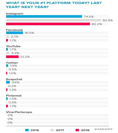 Almost 93% of the social media influencers focus on Instagram, and the similar trend was seen in 2017. You can also see the percentage is high in the previous year before. This stats also show that the year 2018 will again see Instagram as a platform with the highest percentage.