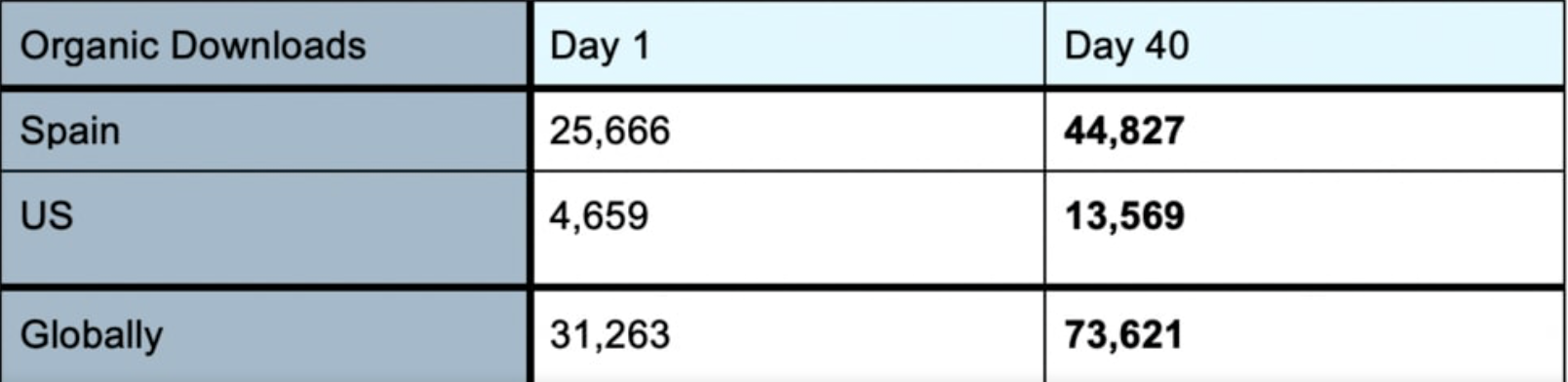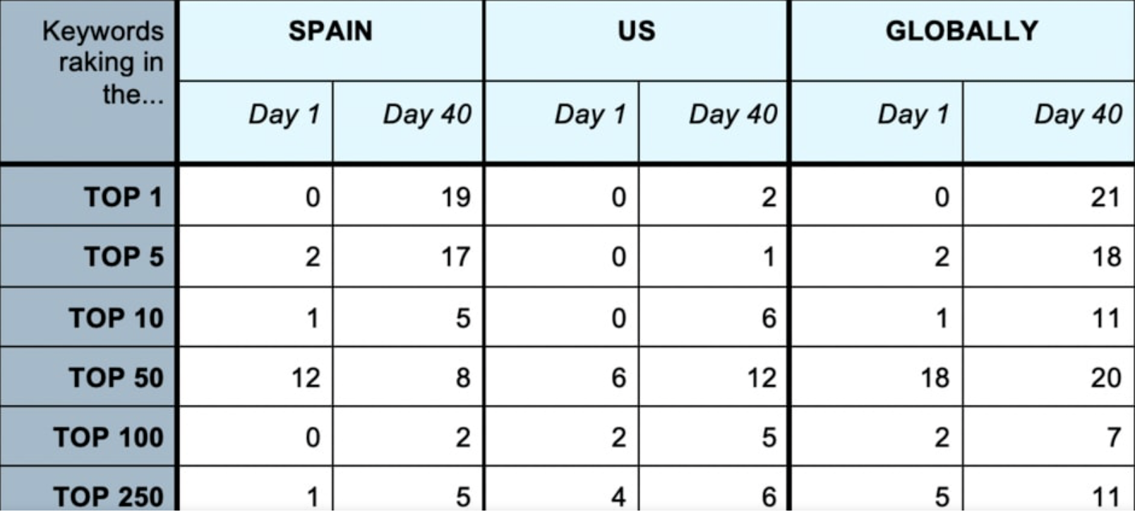 In no more than 40 days, the improvement was obvious: the app went from 16 to 56 ranking keywords in Spain, from 12 to 32 in the US and from 28 to 68 globally.