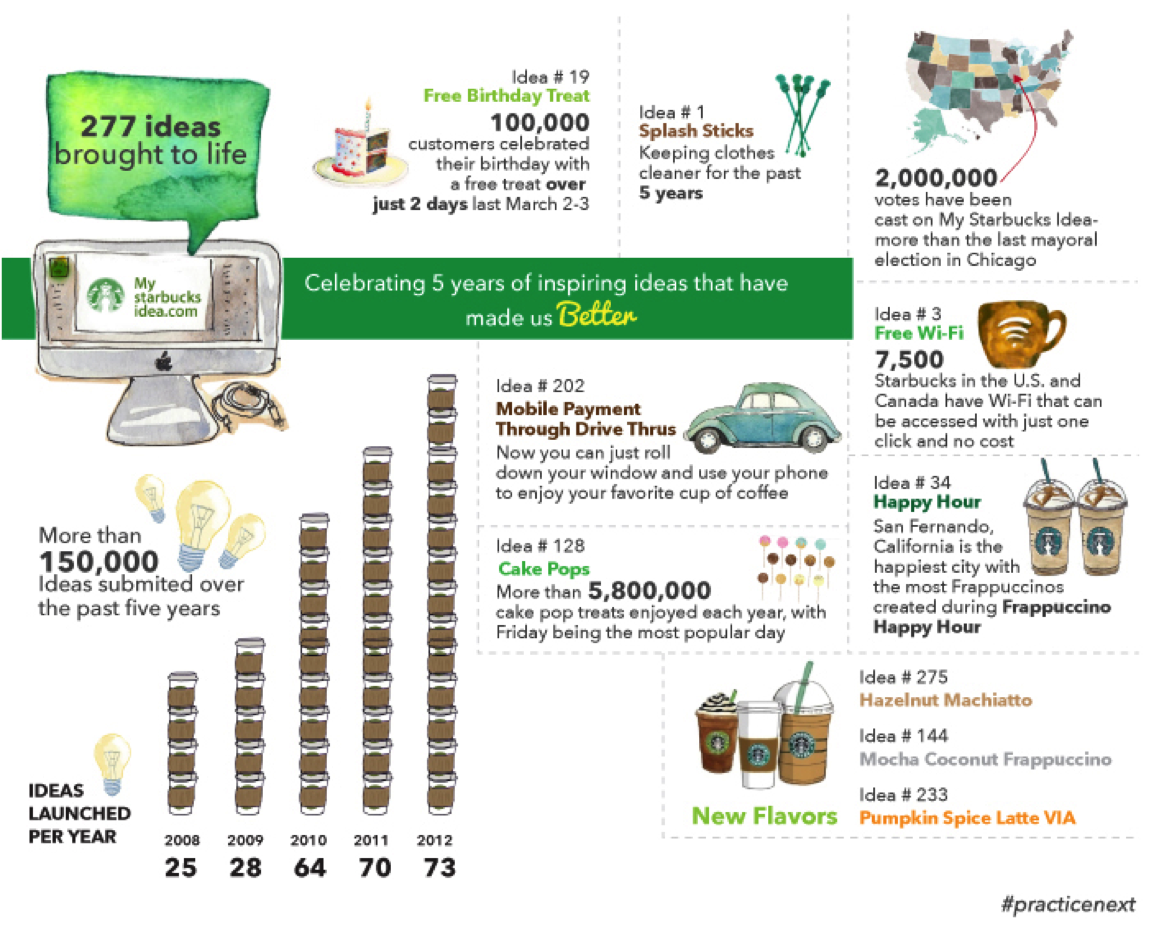 Starbucks started a crowdsourcing tournament called MyStarbucks in 2008. It reported more than 150000 ideas for the food and beverage company, off which 277 were put to work by Starbucks.