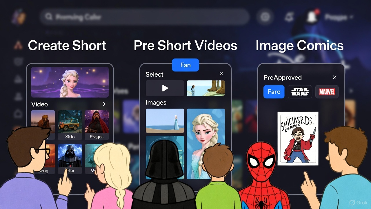 It’s not an open playground. Everything stays inside strict guardrails: you pick a franchise, choose from pre-approved scenes, outfits, voices, and backgrounds, and the AI assembles a short clip or comic for you. Think of it as a super-fancy sticker book with real voices and animation, but powered by generative AI.