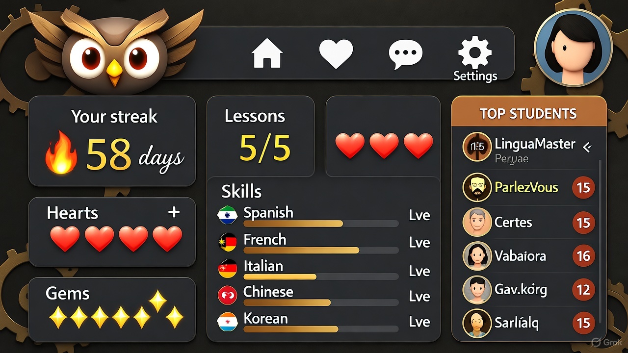 Then there’s the streak: the number of consecutive days you complete at least one lesson. You can “freeze” it, but only with a paid subscription. There are daily quests, achievement badges, and a widget that shows the owl’s mood based on your activity.