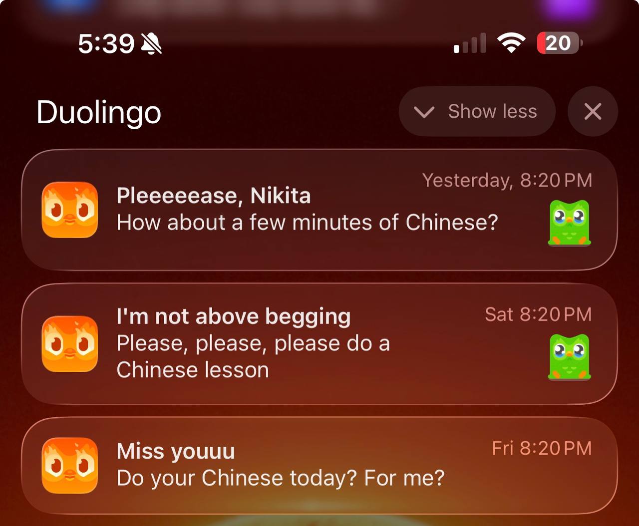 When you’re consistent, it’s all friendly vibes. Skip a day, and the owl turns passive-aggressive: “You’re really going to quit now?” “You can still fix this!” Ignore it longer, and the tone shifts to outright shade. But if you ghost the app for too long, the owl flips to groveling: “It’s been five days. I just wanted to help you learn Chinese.”