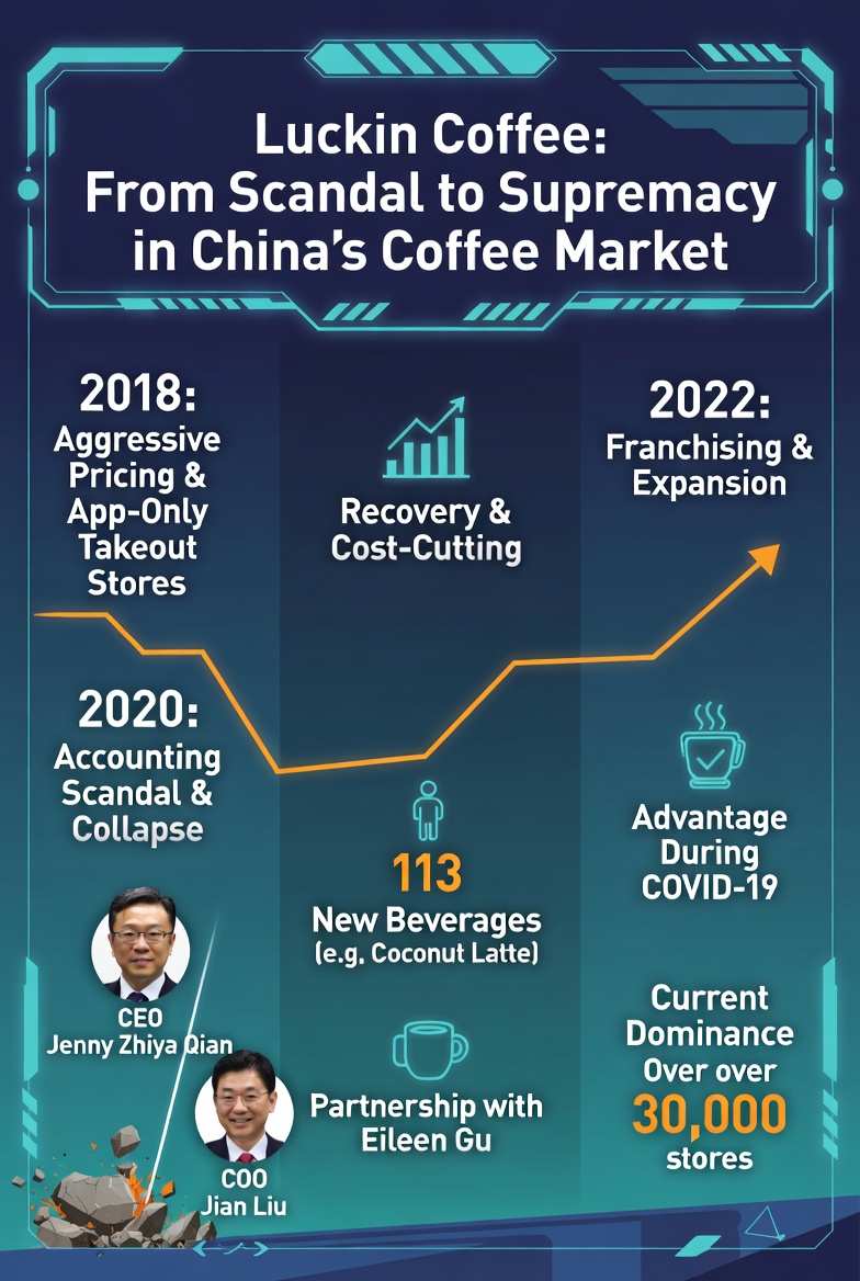 By 2023, Luckin had surpassed Starbucks in China revenue for the first time, emerging from bankruptcy stronger and more agile.