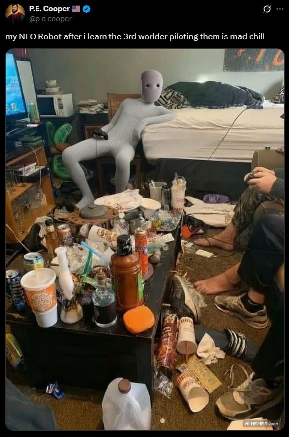 But the real gold lies in the darker humor. A wave of memes highlighted NEO's teleoperation feature - where remote human "experts" in VR headsets control the bot via 1X's app to teach it new tasks.