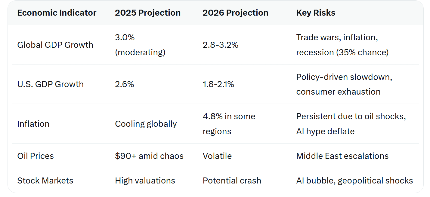 Predictions for 2026 paint a mixed but ominous picture. While Goldman Sachs forecasts "sturdy" global GDP growth of 2.8%, others like J.P. Morgan warn of a 35% recession probability, fueled by Trump's tariffs, inflation, and potential AI bubble bursts. Economists sound alarm bells about a "financial crisis of 2026," citing high leverage in non-bank systems, proliferating climate disasters, and public-debt burdens. The card house isn't merely collapsing; it's turning to ash, with the frame teetering in real time. As NPR's roundup suggests, mediocre growth at best, with headwinds from trade wars and Fed interference.