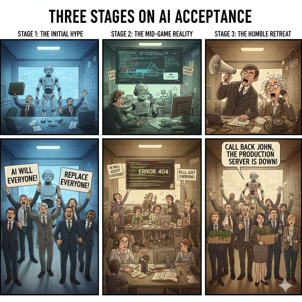 This corporate journey can be perfectly summarized in the Three Stages of AI Acceptance: