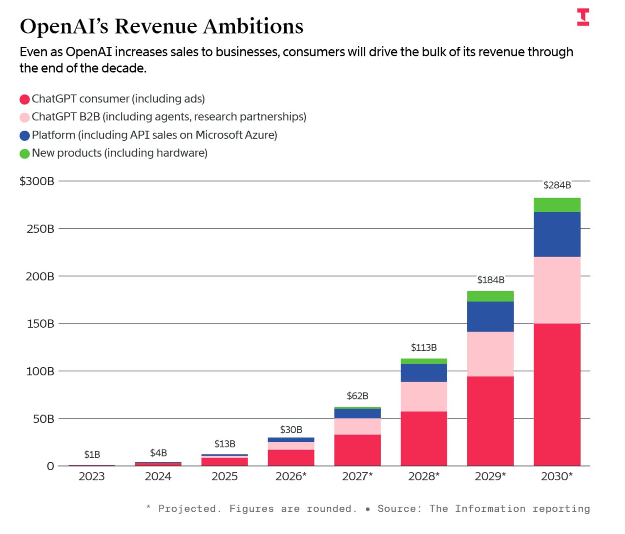 Looking ahead, OpenAI now anticipates $30 billion in revenue for 2026, climbing to $62 billion in 2027—modest upward revisions from earlier estimates. Consumer sales are expected to double to $17 billion this year, eventually reaching $150 billion by 2030, comprising over 50% of total revenue.