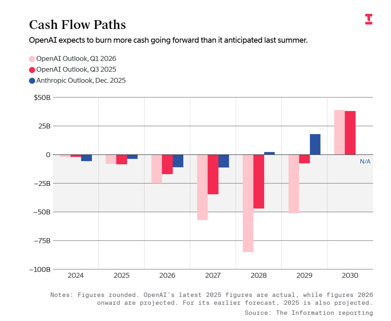 While revenue soars, costs are skyrocketing even faster. OpenAI now forecasts burning through $665 billion on AI operations and training by 2030—$111 billion to $112 billion more than prior predictions. This includes $25 billion in expenditures for 2026 and $57 billion in 2027, a combined $30 billion hike from earlier forecasts.