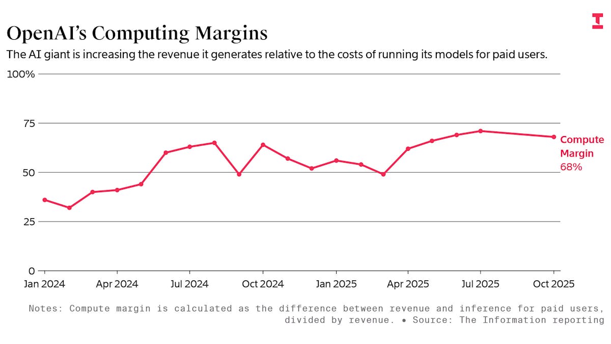 According to internal financials reported by The Information in December 2025, the company's "compute margin" - the share of revenue remaining after deducting inference costs for paying users - reached approximately 70% in October 2025.