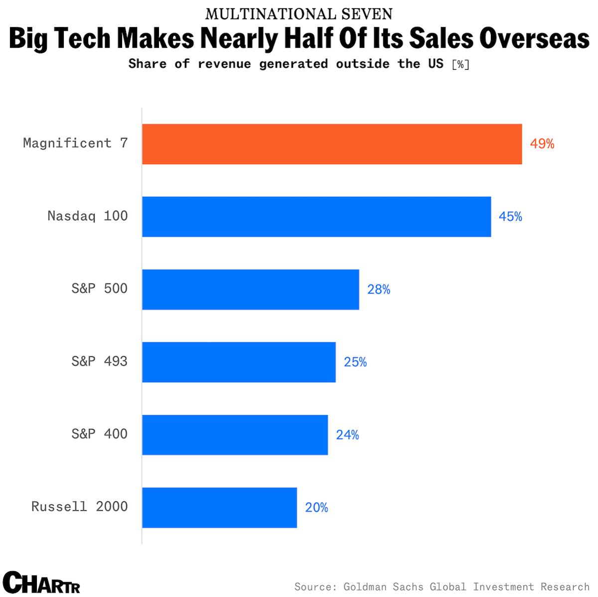 Multinational corporations like 3M, PepsiCo, and Netflix have credited their strong second-quarter results to favorable exchange rates, highlighting the currency’s tailwind. However, the biggest beneficiaries are the tech giants of the “Magnificent Seven,” which derive 49% of their revenue from abroad — well above the S&P 500 average of 28%.
