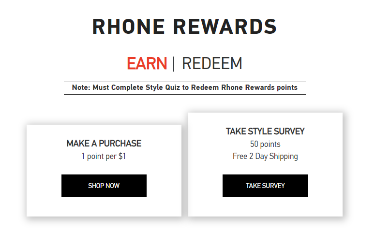 For instance, Rhone has a loyalty program called Rhone Rewards. Their loyalty program encourages customers to make more purchases. Customers get rewarded with a point for every dollar spent. Once the points accumulate, they redeem points to receive free products.