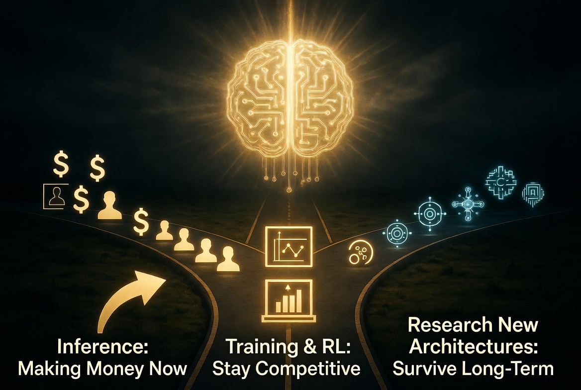 Spending heavily on inference today brings cash flow, but risks technological obsolescence. Pouring resources into training keeps you competitive in the short-to-medium term, yet it may starve the risky, high-upside research needed to leapfrog the field. Neglecting any one of these paths can be fatal in an industry moving at breakneck speed.