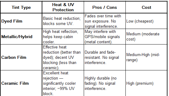 As shown above, ceramic tints offer the top performance — cutting significant heat and UV while avoiding fade or signal issues — but they come at a high cost. Carbon tints provide a solid middle-ground: good heat rejection and durability for a moderate price. Dyed tints are the basic budget choice; they yield only modest cooling and tend to fade sooner. Metallic (hybrid) tints reflect a lot of heat but can interfere with electronics due to their metal content.