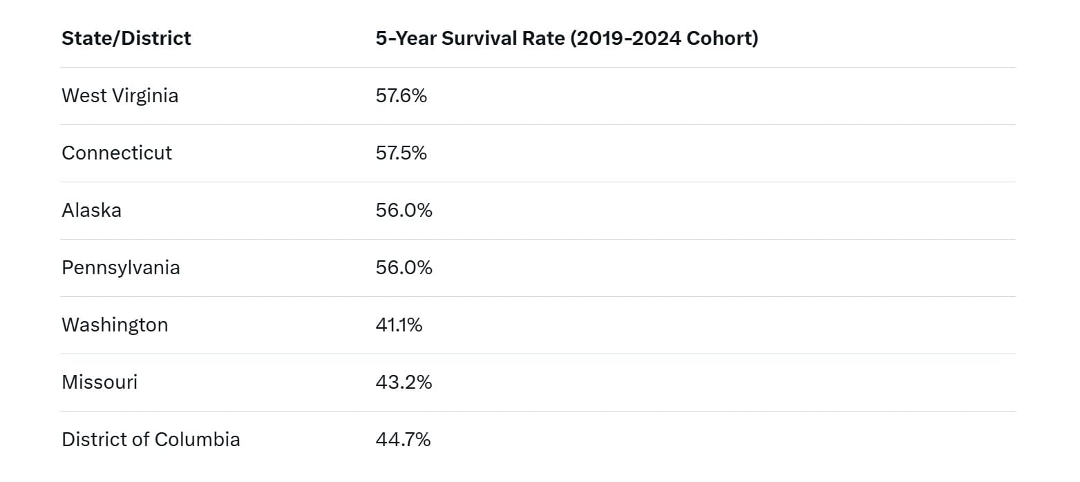Survival isn't uniform across the U.S.; geography plays a pivotal role, influenced by local economies, regulations, and support ecosystems. In 2024, states like West Virginia boasted the highest five-year survival rate at 57.6%, edging out Connecticut's 57.5%. Alaska and Pennsylvania followed closely at 56%, benefiting from stable industries like energy and manufacturing that buffer against volatility.