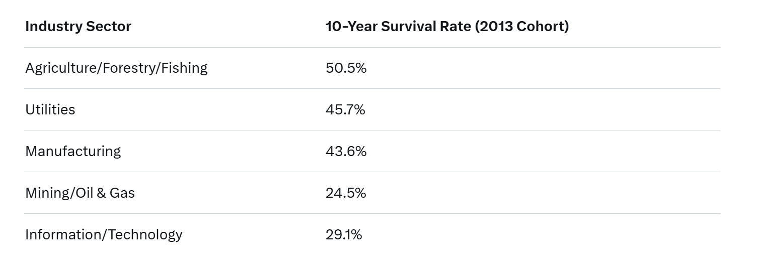 Sector choice amplifies or mitigates risks. Stable, regulated industries like agriculture, forestry, fishing, and hunting lead with a 50.5% 10-year survival rate for the 2013 cohort, buoyed by consistent demand and government subsidies. Utilities follow at 45.7%, their monopolistic structures shielding them from fierce competition.