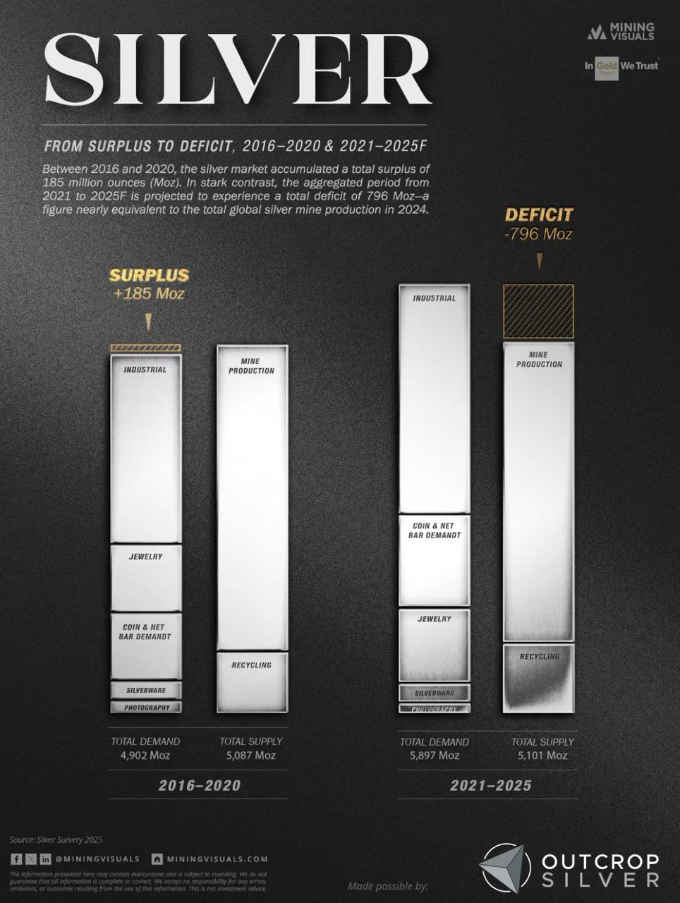 The result? Above-ground stocks continue to erode. Visible inventories at exchanges like COMEX, LME, and Shanghai Futures Exchange have fallen to under 800 million ounces - the lowest since 2011 - representing less than 10 months of global demand.