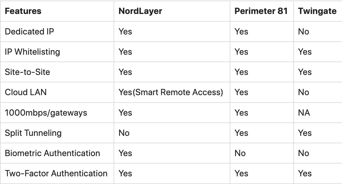 Let’s look at the comparison skeleton between the world’s top most-used business VPN servers. NordLayer, Perimeter 81, and Wingate.