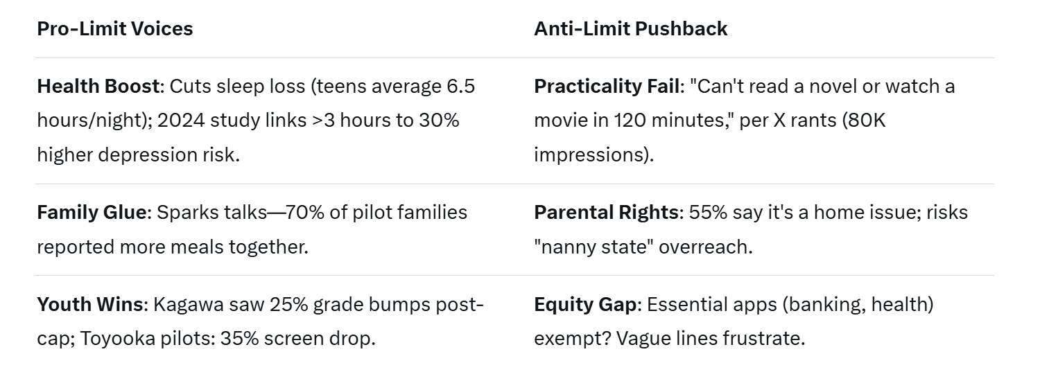 Critics like sociologist Hiroshi Ishida warn of cultural clash: Japan's collectivist ethos favors harmony, but mandating "off" time risks shaming non-conformists. Supporters, including the Japan Pediatric Society, hail it as proactive: "Two hours isn't restriction; it's reclamation."
