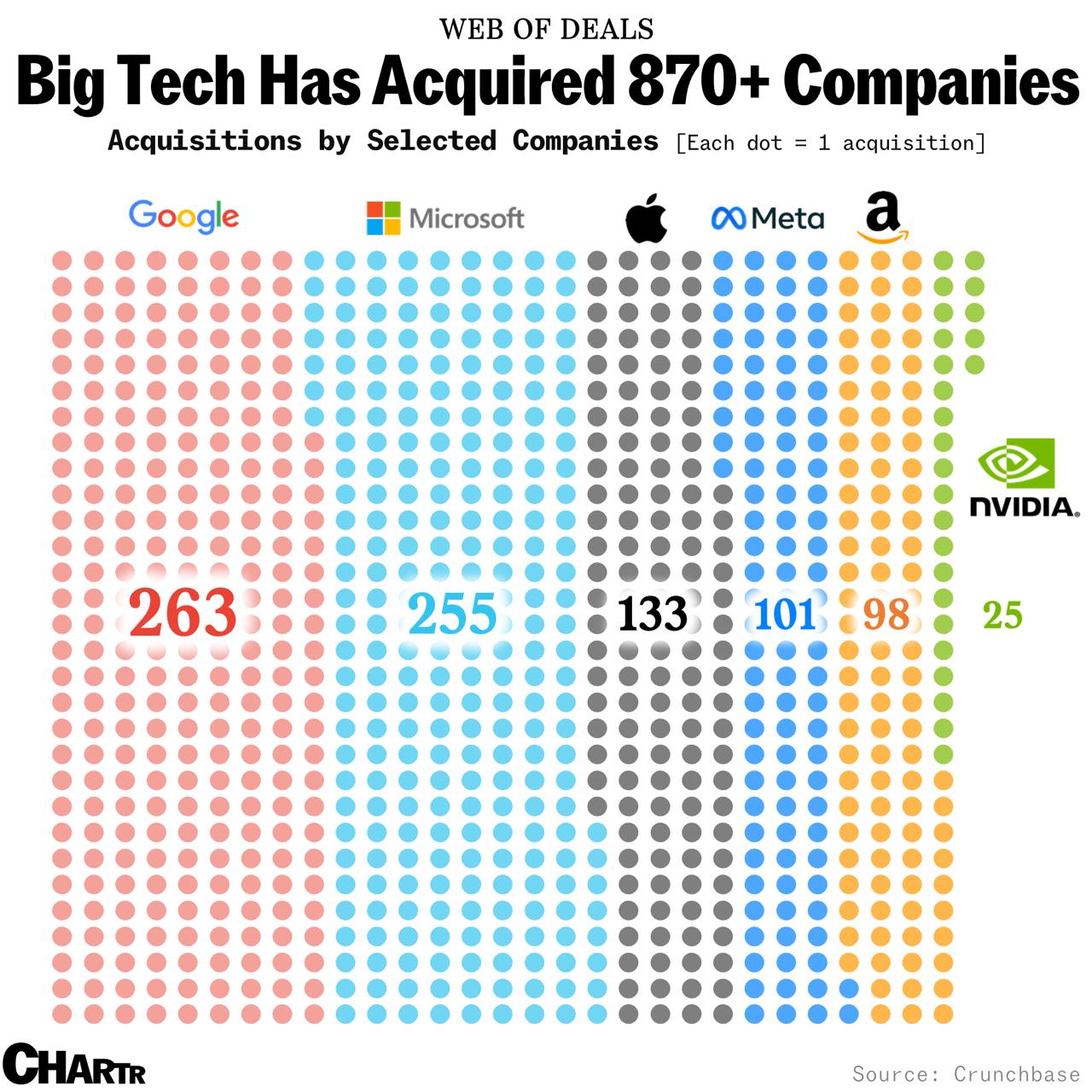 But the real culprit? Big Tech's acquisition spree. Since the late 1990s, these five behemoths – often dubbed the "Magnificent Five" or FAMGA – have collectively acquired more than 800 firms, a number that balloons when including unreported "killer acquisitions" designed to neutralize nascent threats.